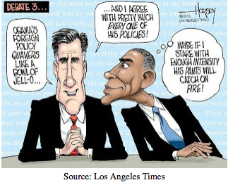 Ce que l’on peut retenir de ce dernier débat c’est qu’il n’y a pas une vision radicalement différente entre les deux hommes concernant les questions de politique étrangère. Même si Obama a dominé le débat, son expérience lui a permis d’être à l’aise et de ne pas se laisser déstabiliser par son adversaire, Mitt Romney est resté prudent, il n’a fait aucune gaffe. Il a clairement affirmé son objectif: un monde en paix. Il ne s’écarte pas vraiment de la politique d’Obama. Ce qui était particulièrement frappant lors de ce débat, c’est qu’il était question de gagner les États clefs et notamment l’Ohio, peu concerné par les enjeux de politique étrangère. Ainsi, les candidats (surtout Mitt Romney) n’ont cessé de revenir sur les questions économiques dès que l’occasion se présentait.